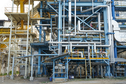 Modern factory with many pipes and tanks with stainless steel construction. This factory can produce various kinds of processed products such as oil.