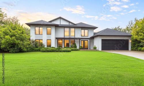Modern family home with lush lawn and bright windows in a serene neighborhood