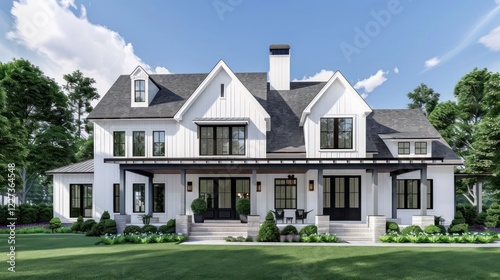 Modern farmhouse with a spacious porch, surrounded by lush greenery and clear blue skies