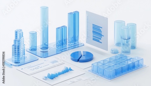 Modern financial analysis graphs and glass models illustrating business performance tracking