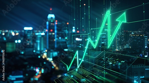 Modern financial data visualization with upward trend line against a city skyline, representing growth and success.