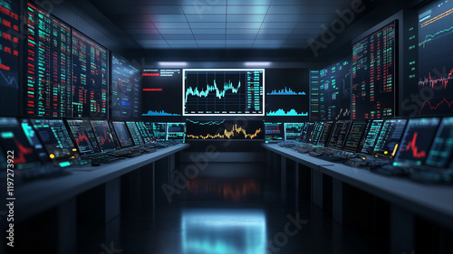modern financial trading room with multiple screens displaying stock market data and graphs, creating high tech and dynamic environment
