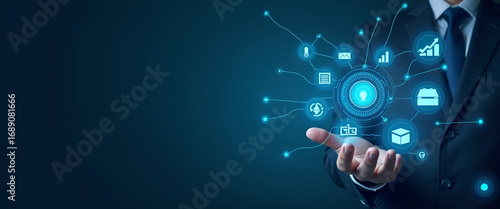 Modern Fintech Wallpaper: Virtual Financial Advisors & Robo Advisors with Digital Icons for Corporate Communications - Minimalist Design with Space for Overlay Text