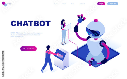 Modern flat design isometric concept of Chat Bot and Marketing decorated people character for website and mobile website development. Isometric landing page template. Vector illustration.