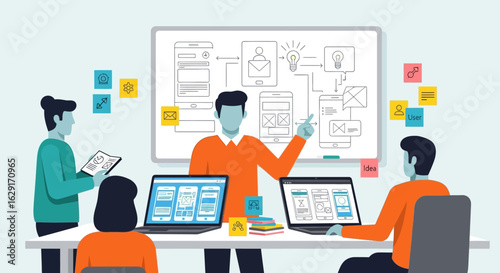 Modern Flat Design Mobile Application Development Team Discussing User Interface Workflow