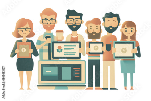 Modern Flat Illustration of Diverse Office Team Working in a Collaborative Workspace Isolated on Transparent Background