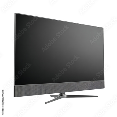 Modern flat screen television displaying a textured gray screen with a sleek silver stand in a studio setting