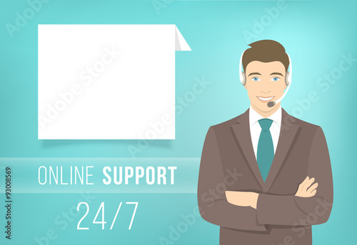 Modern flat vector illustration of young handsome man, employee of call center support and help service with headphones and speech bubble for chat with visitors of website. Helpdesk online concept