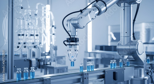 Modern future concept technology. Modern clean room laboratory with robotic arm dispensing liquid into vials, concept of automation and scientific research