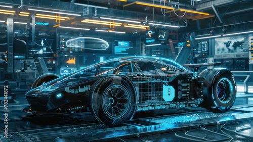 Modern futuristic car under construction wide banner with info datum created with Generative AI