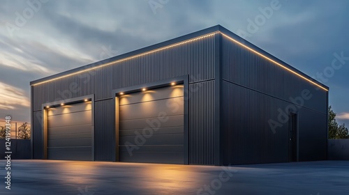 Modern Garage: A sleek, contemporary garage with two large garage doors, illuminated by warm lights against the backdrop of a twilight sky, exudes a sense of modern architecture and functionality.