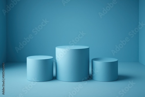 Modern geometric product showcase with cylindrical podiums in azure studio environment
