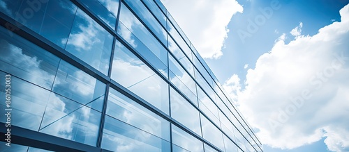 Modern glass building with aluminum facade, viewed from a low angle against a blue sky with clouds, providing a unique perspective and copy space image.