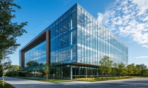 Modern glass building with green trees and blue sky in the background, featuring an eco-friendly office environment. The architecture is sleek and contemporary