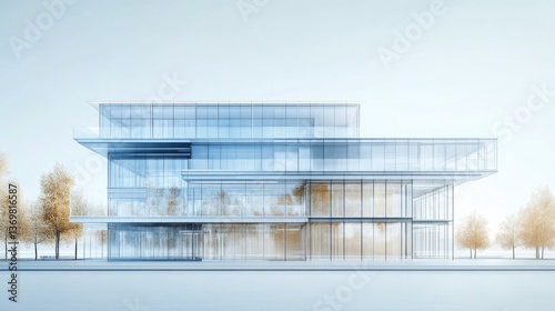 Modern glass building with layered design, surrounded by autumn trees and clear sky