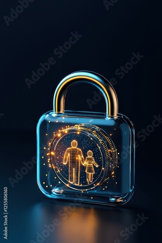 Modern Glass Padlock with Symbolic Representation of Family Protection, Light Effects, and Digital Security Concept on Dark Background