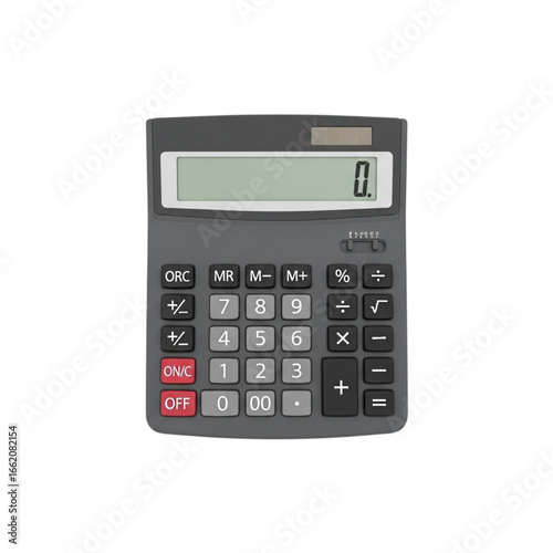 Modern gray digital calculator with clear display and numerous function buttons for office or school use transparent background