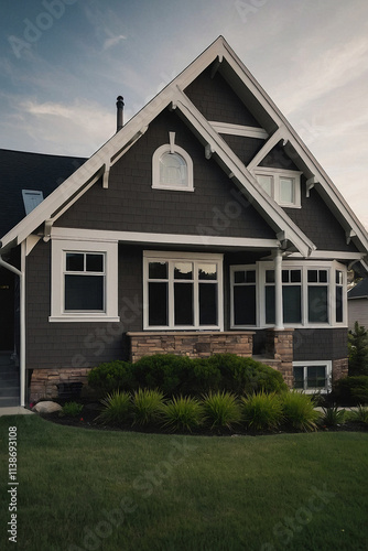 Modern gray house with large front windows and manicured landscaping on a sunny day.
