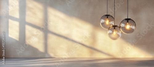 Modern handblown glass sphere pendant lights illuminating minimalist indoor space with soft shadows and ample room for text placement