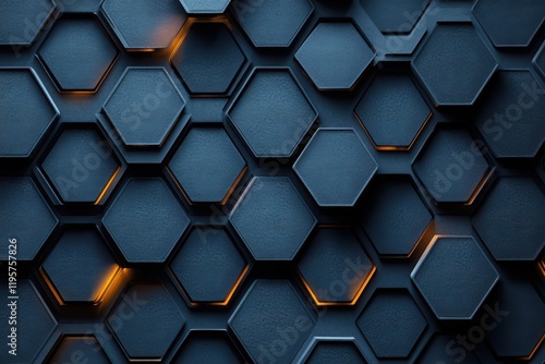 Modern hexagonal texture with dark blue tones and glowing orange highlights