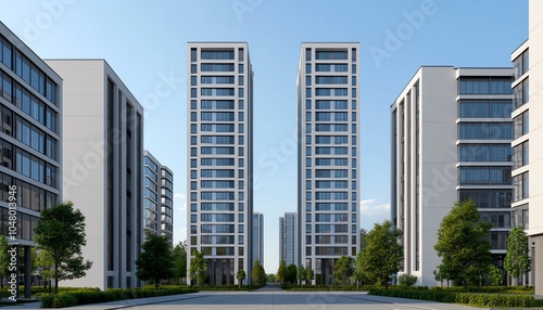 Modern high-rise buildings with sleek designs surrounded by greenery and a clear blue sky. An architectural marvel showcasing urban development and contemporary living.