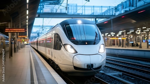 Modern high-speed train arriving at a modern railway station platform during twilight hours, showcasing sleek design and advanced technology. : Generative AI