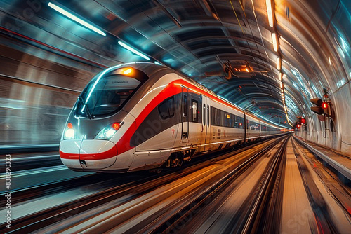 Modern High-Speed Train Traveling Through a Tunnel at Night