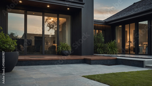 Modern home exterior at dusk, featuring dark gray siding, large windows, a stone patio, and landscaping with potted plants. A low, dark brown wooden deck is visible before the patio.