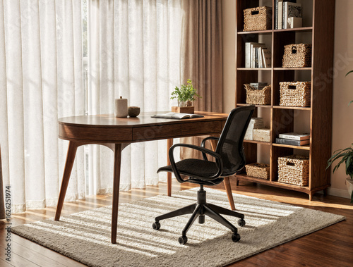 Modern Home Office with Curved Walnut Desk, Ergonomic Chair, and Warm Autumn Light Accentuating Natural Textures