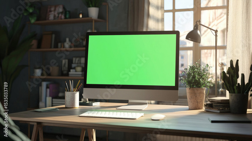 Modern Home Office Workspace with Green Screen Computer Design Inspiration and Productivity Setup