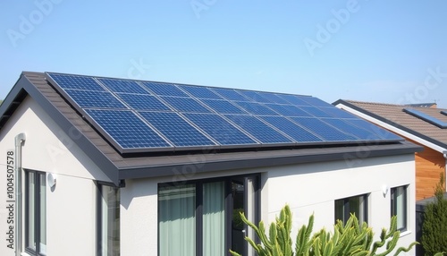 Modern home with solar panels on the roof.