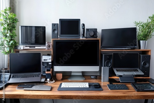 Modern home workstation featuring multiple laptops, computer, and screens showcasing a productive workspace