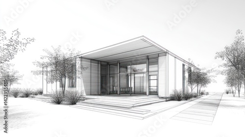 Modern house architectural sketch, exterior view, blueprint style, possible use in architectural design