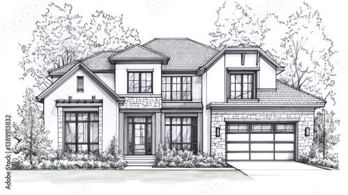 Modern House Architectural Sketch, Exterior View, Trees, Background