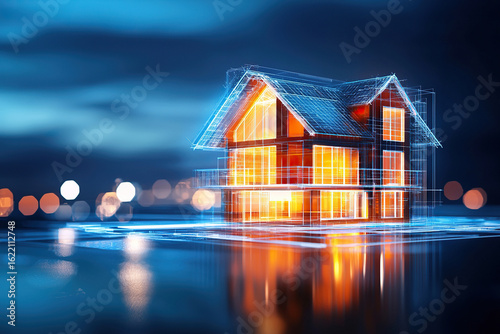 Modern house design illuminated night, showcasing blend of architectural elements and digital rendering techniques. structure reflects innovation