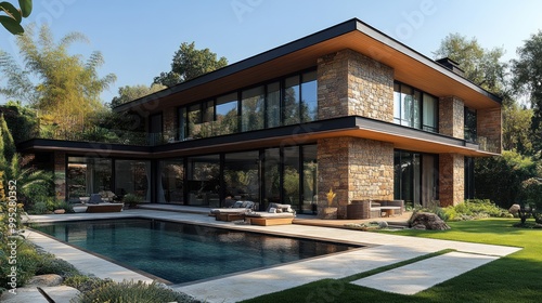 Modern house with a pool surrounded by greenery and outdoor seating.