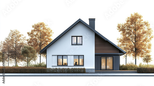 Modern house with autumn trees, white facade, and large windows
