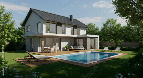 Modern House with Pool Surrounded by Lush Greenery and Clear Sky