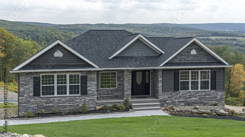 Modern house with stone and vinyl siding exterior, nestled in a scenic autumn landscape.