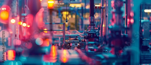 Modern industrial assembly line close up, focus on, copy space, vibrant colors, Double exposure silhouette with machinery