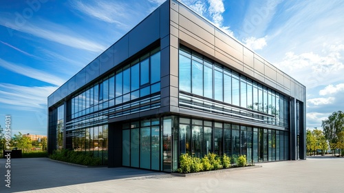 Modern industrial building with sleek lines, large windows, and metallic exterior.