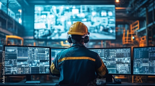 Modern Industrial Control Room Monitoring Production Lines with Efficient Operators and High-Tech Displays