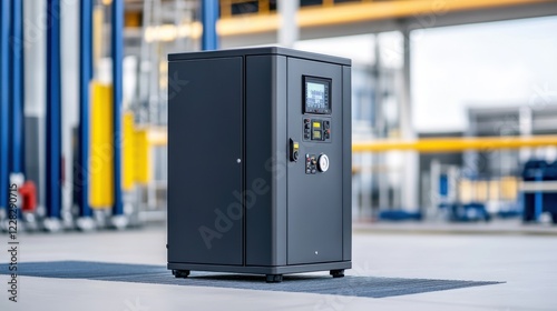 Modern industrial equipment with control panel in a bright factory setting showcasing advanced technology features