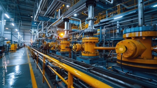Modern industrial interior with complex machinery and pipelines, showcasing engineering and manufacturing infrastructure in a high-tech facility.