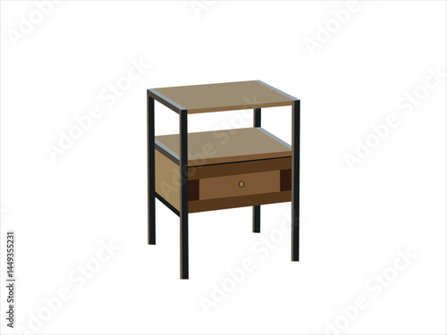 Modern Industrial Nightstand with Metal Frame, Wooden Drawer and Open Shelf, Minimalist Bedside Table for Bedroom Storage, Isolated on White Background Illustration