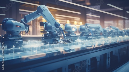 Modern industrial robotic arm assembling components in a brightly lit smart factory.