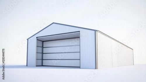 Modern Industrial Shed: A pristine, modern industrial shed stands with an open entrance, showcasing a clean and functional design. Its architecture speaks of efficiency and storage potential.