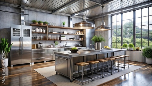 Modern Industrial Stainless Steel Kitchen with Professional Appliances, Sleek Design, and Contemporary Aesthetic for Culinary Enthusiasts and Home Chefs