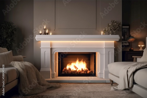 Modern interior design of the living room with fireplace. Super photo realistic background, generative ai illustration