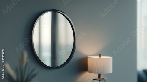 Modern interior design with an oval mirror and a lit lamp against a grey wall, featuring minimalist decor and a soft ambiance.